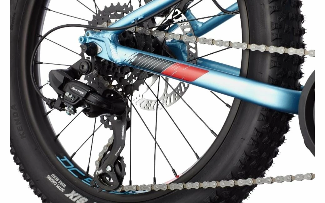 Le CANNONDALE Kids Cujo+, son cadre aluminium, une transmission Shimano en 7 vitesses, ses roues de 20″ à pneus larges, et ses freins à disque hydrauliques.