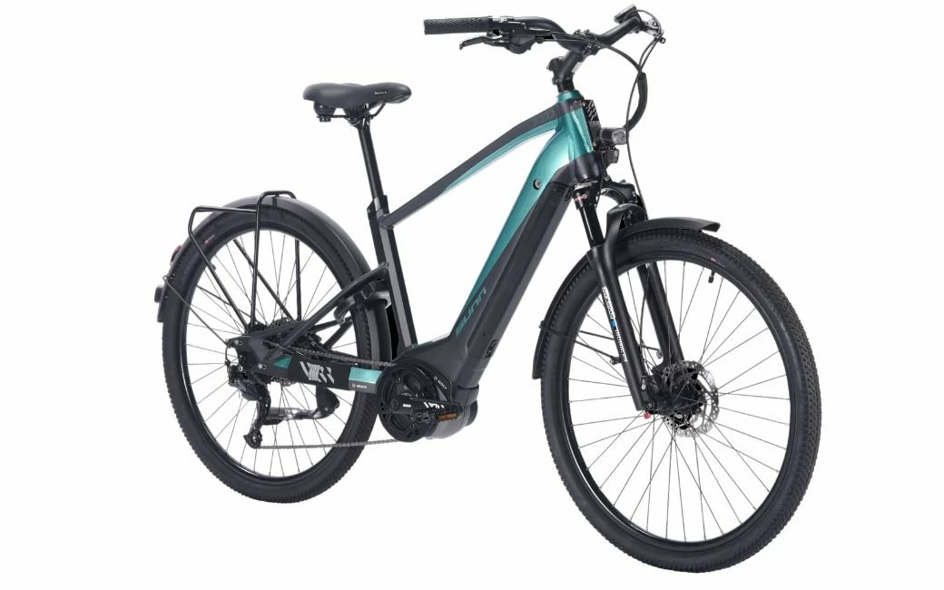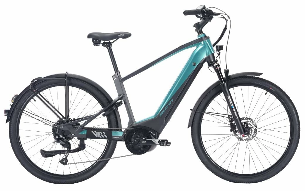 Le SUNN Urb Sleek, son cadre aluminium, une transmission Shimano en 9 vitesses, une motorisation Bosch, ses roues en 27.5″ et ses freins à disque hydrauliques.